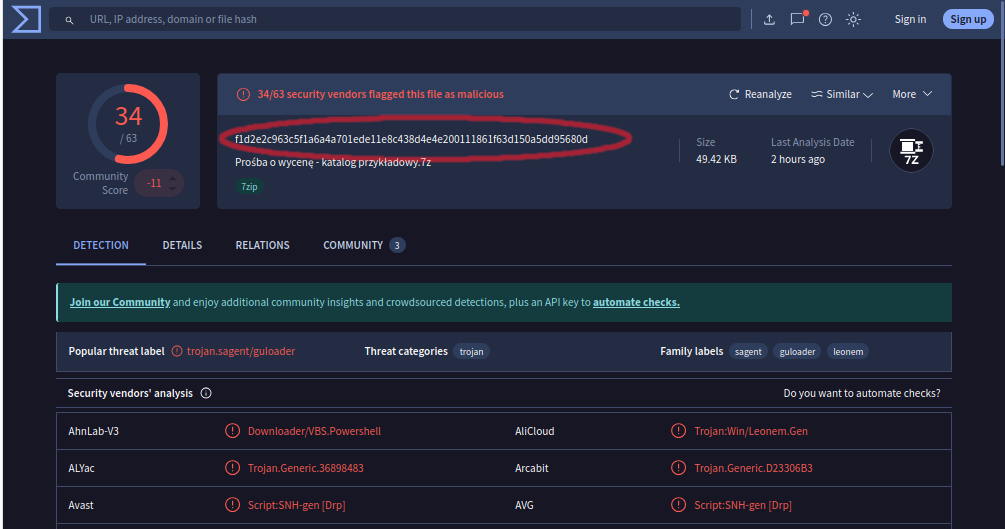 - pokazywany wynik to ilość detekcji, czyli ile silników uważa dany plik za zawierający wirusa/malware; poniższy zrzut ekranu to wynik, gdy rzeczywiście przesłany plik zawierał wirusa/malware.